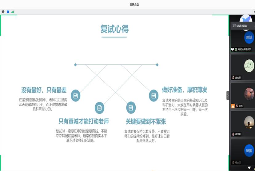 为了进步提高天游ty8线路检测中心登录学生的考研热情,明确考研目标,掌握相关考研技巧,了解更多考研信息。受疫情影响,天游考研经验线上分享交流会于7月18日晚上19:00在腾讯会议举行。本次交流会邀请各年级对考研有兴趣意向的同学参加。交流会由2016级优秀考研学生刘杰主持。此次交流会参与本次经验分享的成员有喻斌(中国海洋大学)、褚雯琪(华中师范大学)、吴立鹏(西安电子科技大学)、查倩(哈尔滨工程大学)、唐俊辉(华中科技大学)。