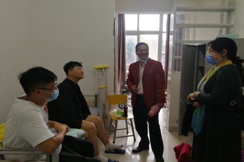 在了解到今年天游新生电气类32006班的周密同学在开学前期打篮球不慎摔伤了腿后,院领导特意前往该寝室探望周密同学,进行慰问和鼓励,并专门为他安排了一间残障备用寝室。