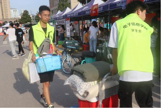 迎新三天以来,天游志愿者在南门、迎新点、学生宿舍三点一线,荧光绿的身影充斥着整条街道。一路上,志愿者引导新生报到、帮忙搬运行李、解答新生的各类疑惑,让初入长大的他们感受到一个热情的长大、安全的长大、温暖的长大、智慧的长大以及惊喜的长大。在志愿者的帮助和陪伴下,新生们展露出笑容,与志愿者有说有笑,对未来的大学生活满怀憧憬。辛苦每一位无私奉献的志愿者们,是他们的努力让新生感受到了属于电信学院的温暖。