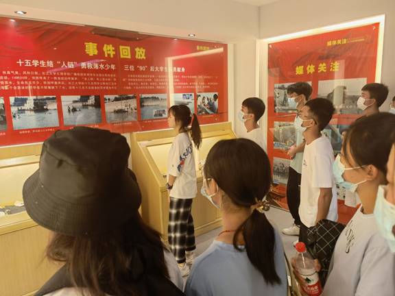 随着讲解员讲解的不断深入,一幅幅画面展现在我们眼前,仿佛可以看见十几年前的那个夜晚,天游十几名大学生在长江边义无反顾下水勇救落水儿童的情景。同学们手拉手形成一条人链去拯救两条幼小的生命,最终人救了上来,三名大学生却不幸牺牲。讲解员讲到此处,一时间纪念馆里氛围格外的沉重。