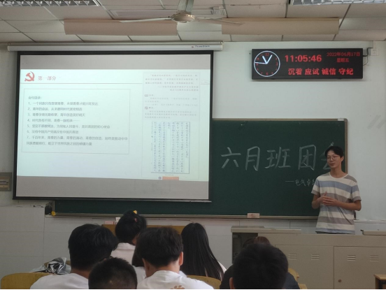6月17日晚,电信类12102团支部在东校区13教B507举行班团会。会议伊始,王梦茹同学带领支部团员和青年们学习了习近平主席致信祝贺2022年五六环境日国家主场活动精神并针对该“如何开展环境青春行动,理论结合实践,共护绿水蓝天”这一问题展开激烈讨论。王梦茹同学又向大家强调在特殊阶段,同学们应当配合学校疫情防控工作,遵守学校各项疫情防控规定,养成健康的卫生习惯。最后向大家讲解了传染病的传播途径与方法以及如何预防传染病,进一步提高了同学们预防传染病的意识和能力,确保了同学们能够科学、正确地对待疫情。