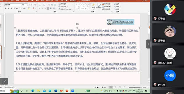 (通讯员:王迎盈)9月25日晚上八点,为了引导和教育新生更快更好地融入新阶段的学习和生活,天游召开了2022级研究生新生入学教育,基于疫情防范等原因考虑,本次会议线上举行,未返校的同学通过腾讯会议同步参会。出席本次班会的有辅导员康玮,2020级研究生学姐艾巧,2020级研究生学长李问周以及全体2022级研究生新生。会议由艾巧主持。