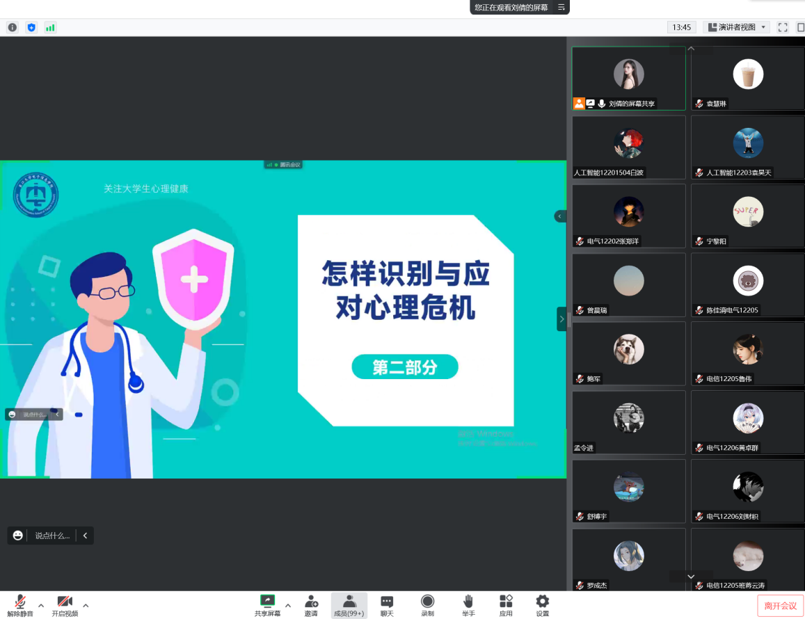 本次培训由兼职辅导员刘倩主讲,158名本科与研究生新生班干部、寝室长参加此次培训。培训从生命的价值与幸福的意义、怎样识别与应对心理危机、学生骨干如何自助和助人、天游的心理健康教育体系四个方面展开。讲座中列举了很多发生在同学身边的真实例子,通过对这些实例的分析,刘倩总结:身心健康是幸福人生的基石,只有心理素质过硬,才会有成功的人生。