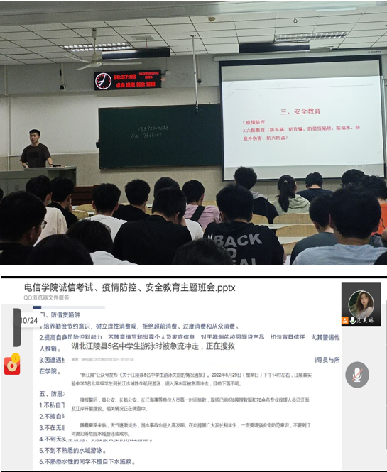 在安全教育方面,组织学生学习“防疫情”、“防溺水”、“防电信诈骗”、“防意外伤害”“防网贷”等安全知识,教育引导学生提高防范的意识。在毕业班班级,组织全体毕业生学习了《长江大学关于禁止学生在校学习期间饮酒的暂行规定》,强调将不组织任何形式的毕业生聚餐活动,严格遵守疫情防控规定,做到安全离校、文明离校。