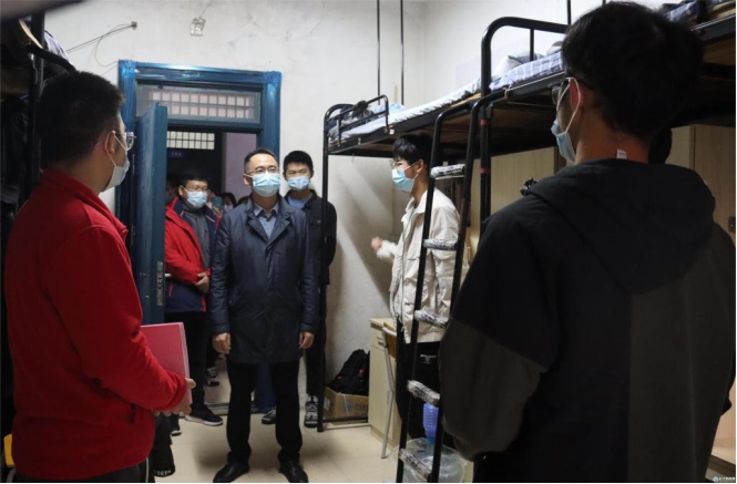 10月9日晚,学校和学院领导深入学生宿舍走访慰问,关心学生在疫情防控期间的生活情况,了解学生生活状况和生活需求,同时向学生们解读疫情防控政策,嘱咐学生在疫情防控期间不聚集,做好个人防护,注意宿舍通风,保持卫生。
